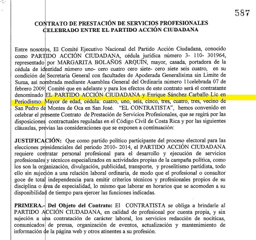Para la del 2010, firmó el contrato con el PAC como “lic en periodismo”, a pesar de carecer de título universitario. El objeto del acuerdo era la “redacción de noticias, comunicados de prensa, organización de eventos, actualización y mantenimiento de información de la página web y otros atinentes a su profesión”.