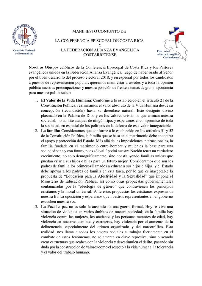 El documento que motivó la sentencia decía: "Hacemos un llamado a todos los cristianos y a los ciudadanos a participar en las elecciones del 4 de febrero, meditando delante de Dios y de sus conciencias su voto para los cargos de presidente y de vicepresidentes y para diputados, conscientes de que es un deber para todo ciudadano costarricense el elegir a quienes detendrán puestos de responsabilidad política".