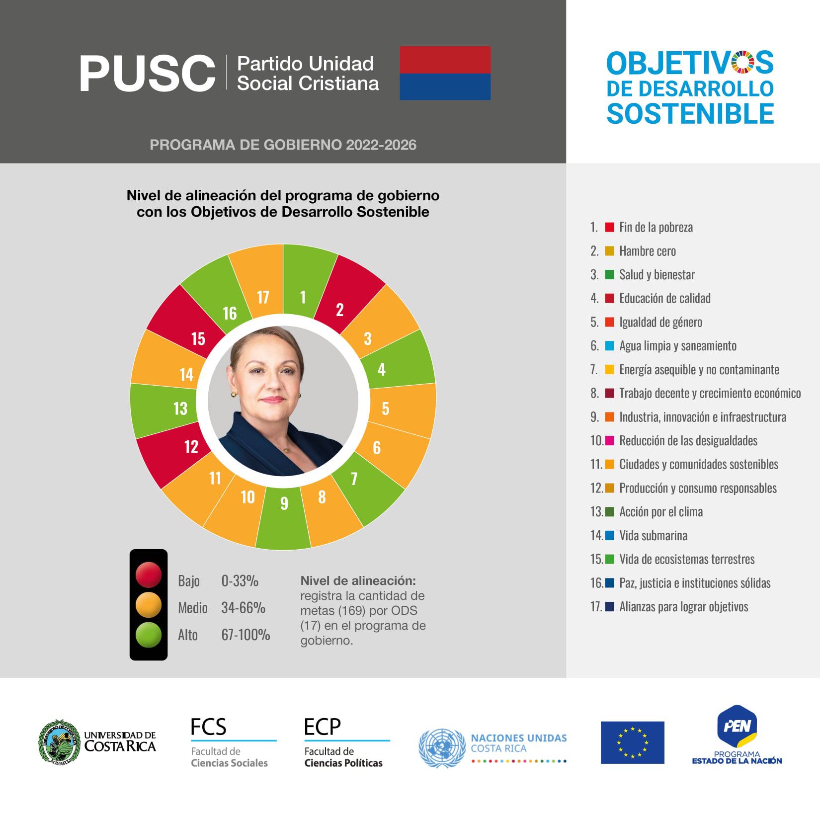 Lineth Saborío, la excandidata del Partido Unidad Social Cristiana (PUSC), obtuvo niveles de concordancia bajos con respecto a los ODS en tres de las 17 áreas estudiadas, y con niveles medios en ocho aspectos más.