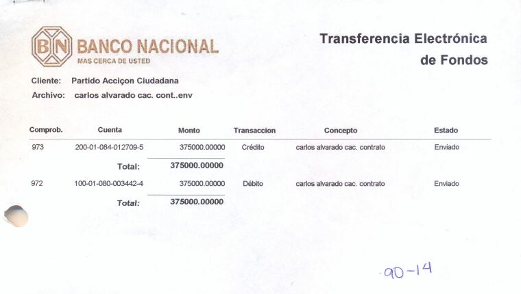 A ello, el partido agregó un cheque de ¢750.000 correspondiente a octubre y cuatro transferencias bancarias correspondientes a los meses comprendidos entre noviembre y febrero por un total de ¢2.625.000 (el último pago fue de ¢375.000 por tratarse de medio mes).