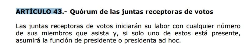 Si alguno de ellos no se presenta, el artículo 43 del Código Electoral dispone que la junta puede funcionar válidamente con un solo miembro.