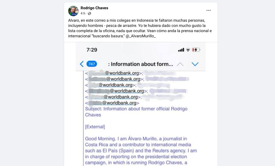 Aunque el texto de Chaves fue eliminado de la red social, aún se encuentra una imagen de los correos electrónicos de las funcionarias del BM en los perfiles del candidato en Twitter y Facebook.