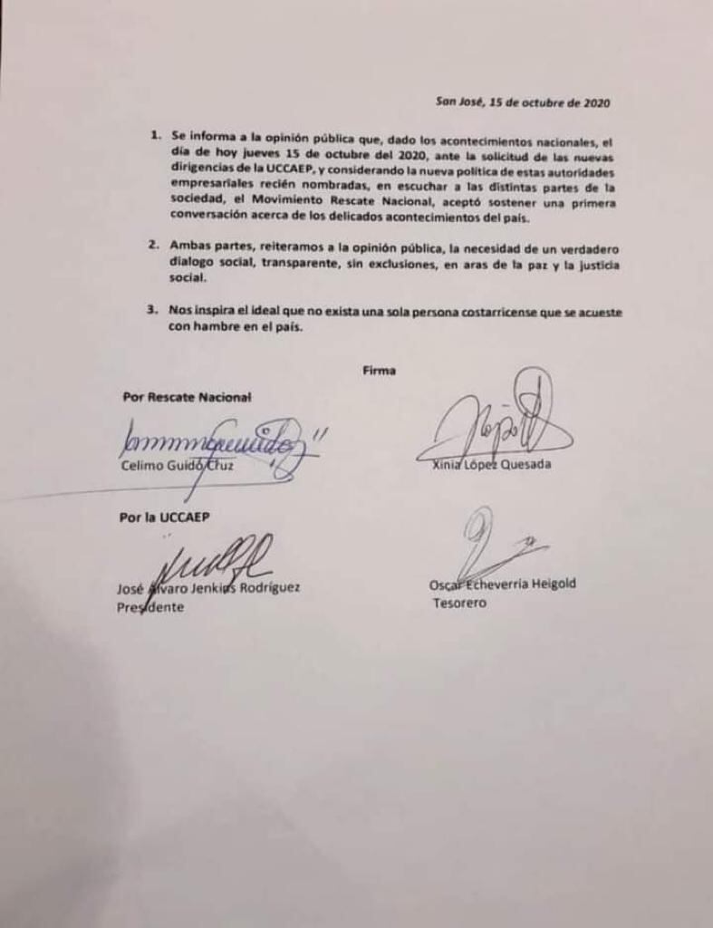 Albino Vargas, dirigente con el cual históricamente los empresarios se han enfrentado, dio a conocer en su cuenta de Twitter que “Uccaep le pidió al Movimiento Rescate Nacional una reunión de la cual salió el comunicado que aquí se les comparte. Fuimos testigos”, escribió.
