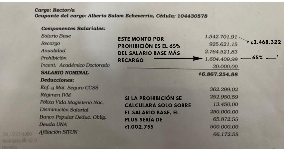 El pago por prohibición para el rector de la UNA despertó dudas y polémica la semana pasada cuando el diputado liberacionista, Jorge Fonseca, le cuestionó al jerarca universitario si había recibido ¢20 millones de más por ese plus. La pregunta se la hizo en la comparecencia de Salom ante la Comisión de Ciencia y Tecnología del Parlamento.