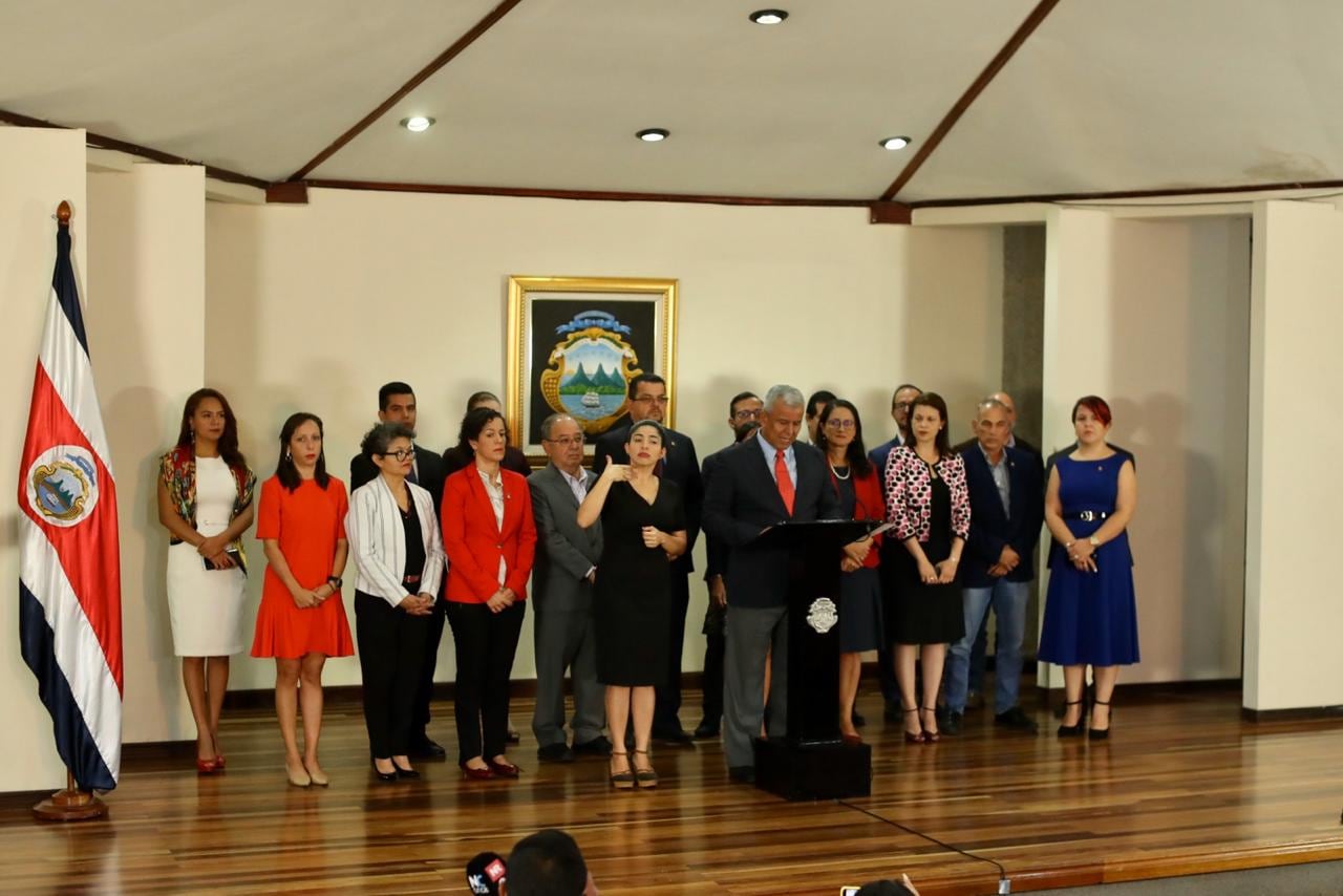 El exministro hizo el anuncio rodeado de los diputados del Partido Acción Ciudadana (PAC) y de miembros del gabinete, como Geannina Dinarte, ministra de Trabajo; Nancy Marín, ministra de Comunicación y Juan Luis Bermúdez, jerarca de Desarrollo Humano e Inclusión Social.