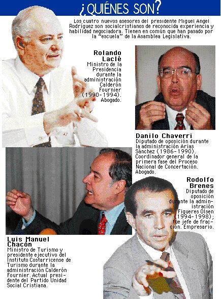 La fuerte reacción que la opinión pública tuvo en contra del aumento del 171 por ciento en el salario del mandatario Miguel Angel Rodríguez, al cual este renunció el jueves pasado, impulsó al Poder Ejecutivo a integrar un nuevo equipo de asesores presidenciales con personas de amplia experiencia en la arena política.