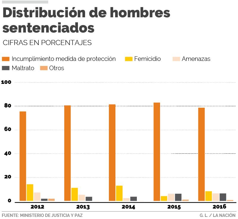 Ese mismo documento, que recopiló cifras para los cinco años comprendidos entre enero del 2012 y diciembre del 2016, también reveló que entre los tipos de delitos cometidos por las personas sentenciadas por la Ley de Penalización de Violencia contra las Mujeres, alrededor de un 80 % incumplieron una medida de protección.