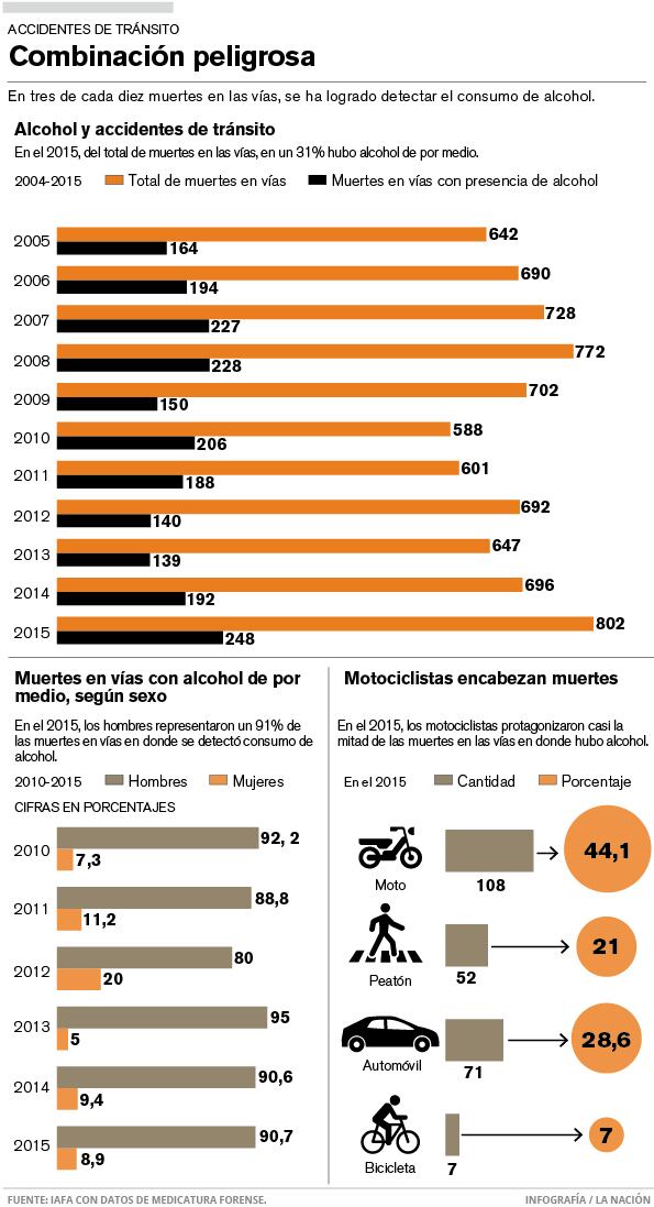 Roy Rojas, del Cosevi, explicó que este problema de salud pública tiene un rostro masculino: la mayoría de las víctimas mortales son hombres solteros o divorciados, en edades productivas (entre los 20 y 40 años), y que acostumbran consumir bebidas alcohólicas los fines de semana.