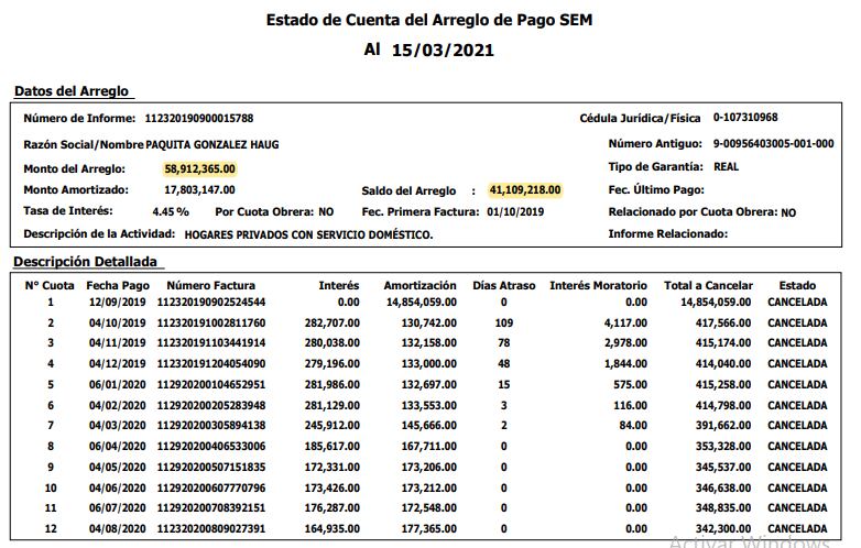 Un estado de cuenta emitido en marzo y enviado por González a La Nación permite corroborar la deuda por ¢58,9 millones, el primer pago se efectuó en setiembre de 2019 por ¢14,8 millones y a partir de ese momento ha pagado sumas mensuales que oscilan entre ¢338.000 y ¢417.000.