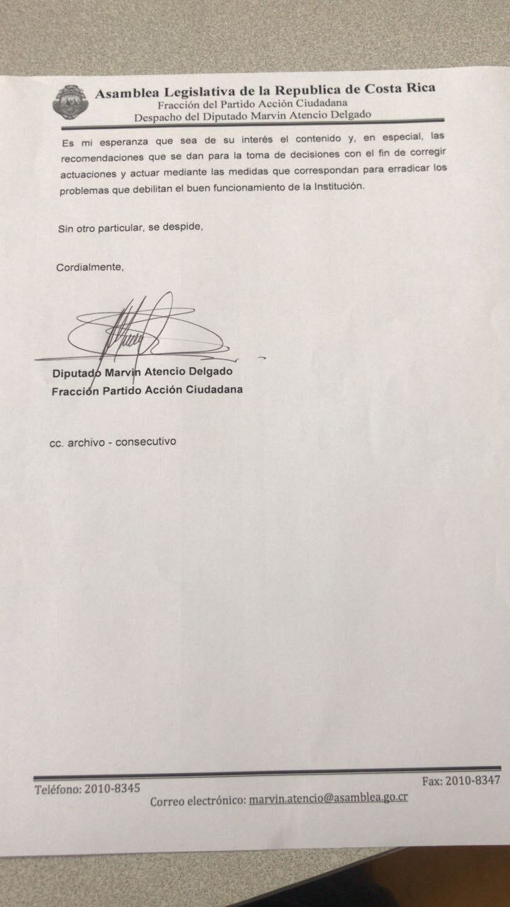 El acuerdo para enviarlo a estudio el documento, emitido en setiembre de 2015, se tomó el 11 de enero de este año, luego de recibir el mes pasado una carta del diputado del Partido Acción Ciudadana (PAC), Marvin Atencio Delgado, uno de los cinco legisladores del foro que investigó la crisis en el México.