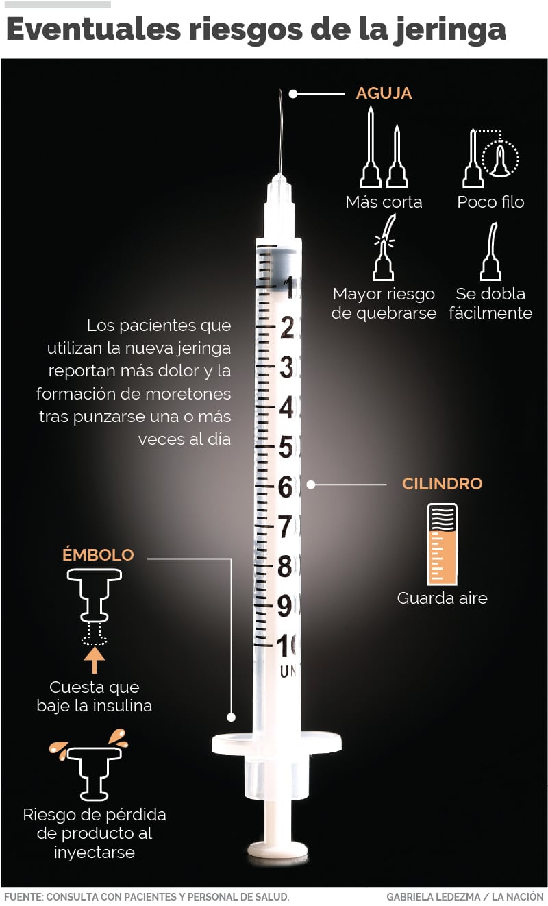 Laura Murillo Cordero, quien ha vivido 36 de sus 40 años como diabética tipo 1, asegura que la nueva jeringa viene con una aguja sin suficiente filo, lo cual dificulta que entre en la piel. Cuando la saca, asegura, siente que jala tejido.