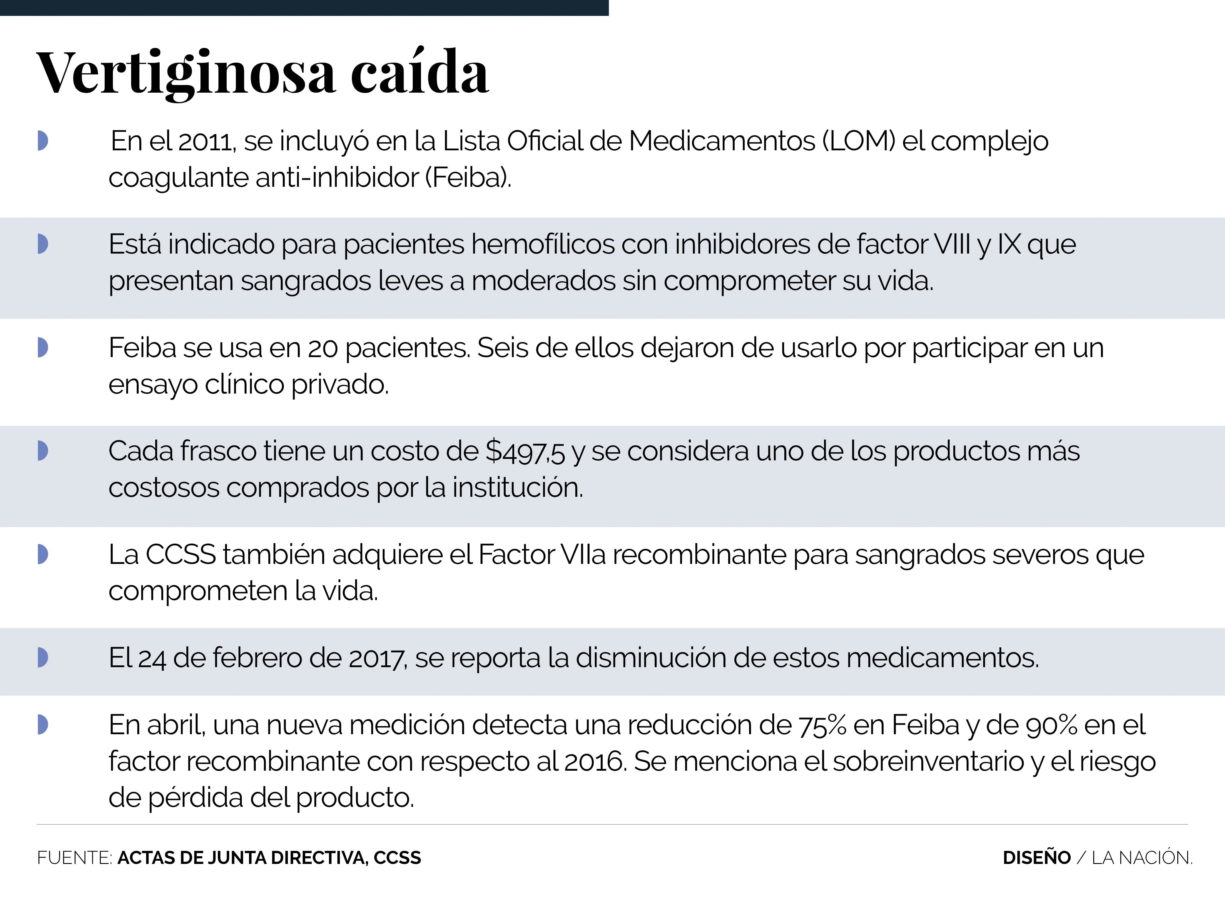 Ese traslado provocó una caída en el consumo del producto de la CCSS –que ya había sido adquirido previamente–, al punto de registrar disminuciones de un 75% (en el caso del Feiba) y un 90% en otro fármaco, conocido como Factor VII recombinante, entre el 2016 y 2017.