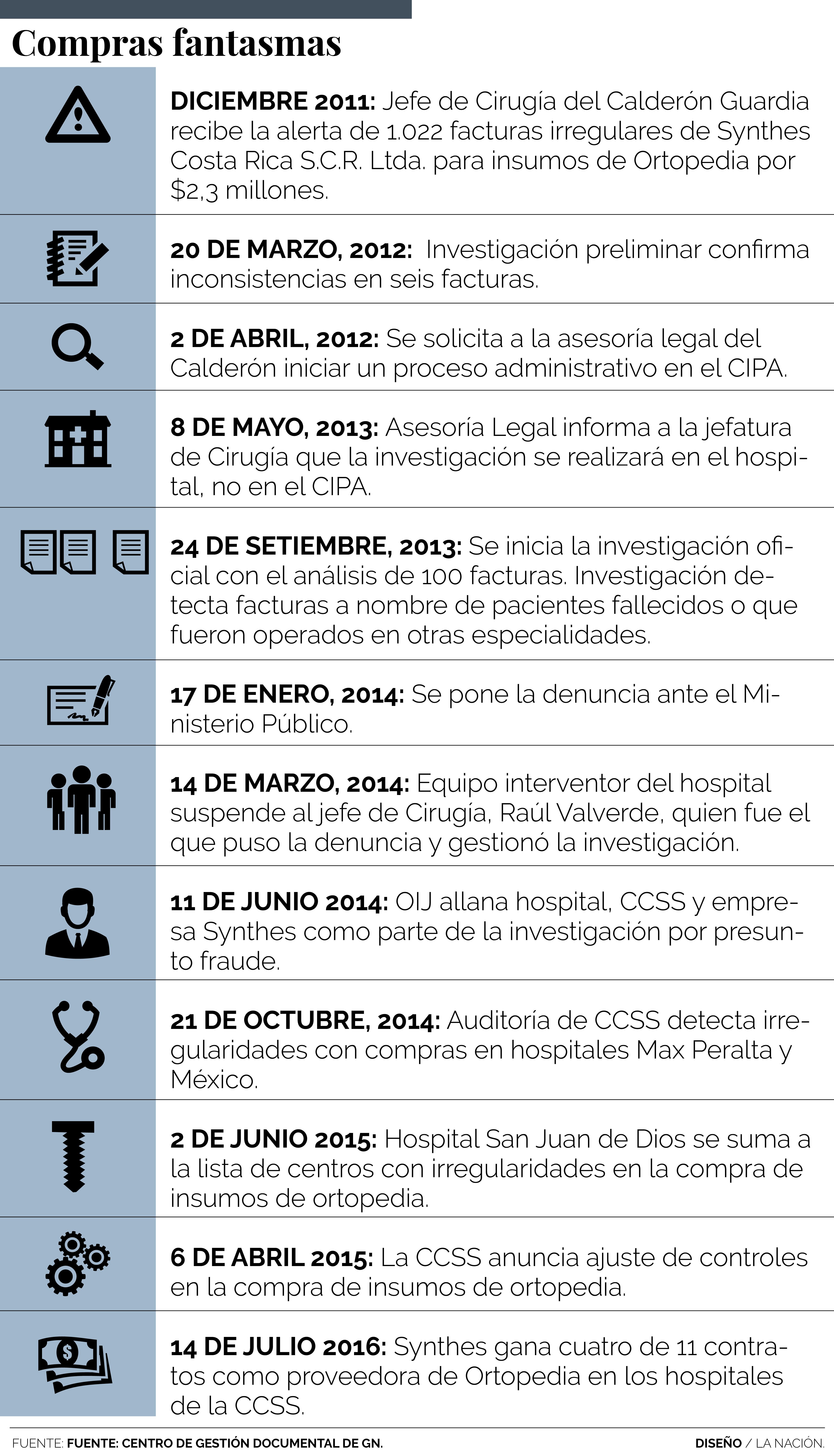 El llamado 'caso Synthes' trascendió en enero del 2014, cuando médicos del Hospital Calderón Guardia detectaron anomalías en la tramitación de un importante grupo de facturas por la compra para insumos utilizados en operaciones de Ortopedia, desde clavos hasta prótesis de cadera.