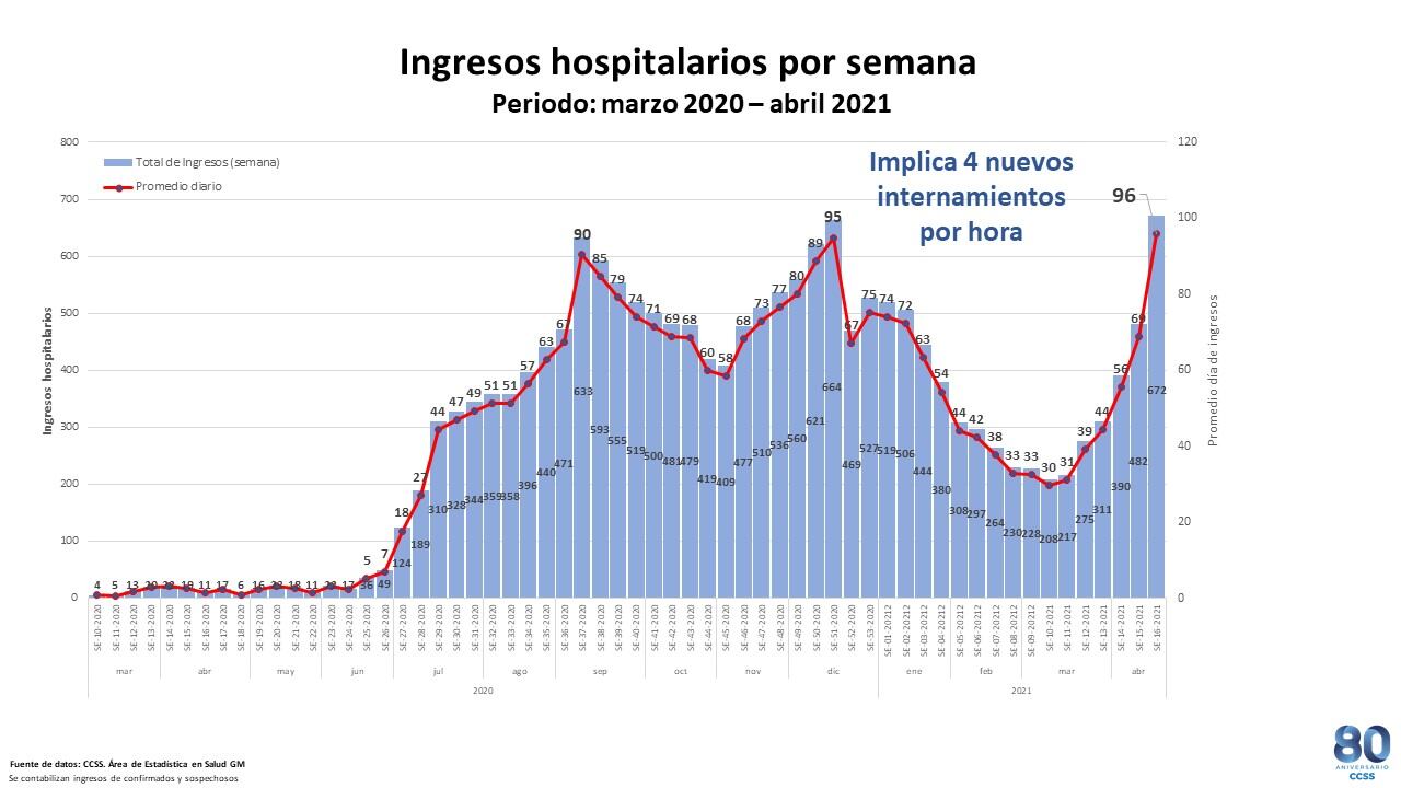 “Entre el 18 y 24 de abril, hubo 662 nuevos ingresos a hospitales. Son 96 ingresos diarios, cuatro por hora, uno cada 15 minutos”, específico Macaya.