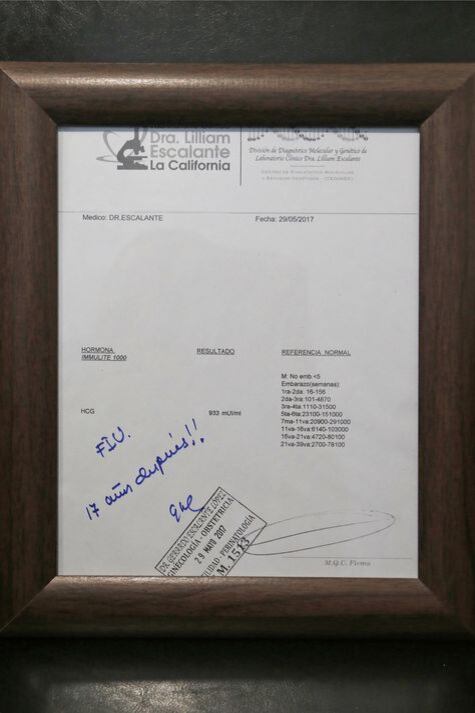 El resultado positivo de la primera prueba de embarazo logrado por el doctor Escalante y la doctora Ribas, está enmarcado.