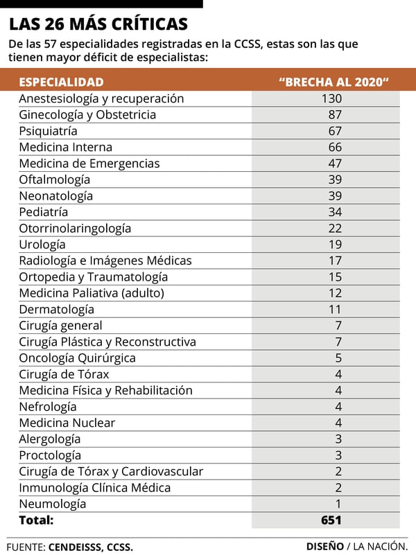 De acuerdo con la CCSS, las especialidades con más residentes son: Anestesiología, Ginecología, Medicina Interna y Pediatría. Le siguen Ortopedia, Medicina de Emergencias, Medicina Familiar y Radiología.