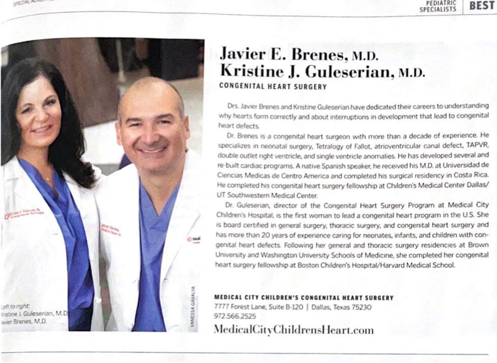 La publicación D Magazine es de las más reconocidas en ese Estado en la cobertura de temas de actualidad. La selección de los mejores médicos la realiza anualmente desde el 2001. De Brenes, la revista destaca su carrera de más de una década enfocada en resolver defectos cardíacos de nacimiento en bebés con pocas horas o días de nacidos.