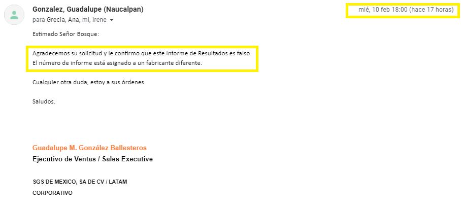 La Nación consultó a la oficina de Société Générale de Surveillance (SGS) en México sobre la autenticidad de los informes. Luego de varias consultas, indicaron que la respuesta la daría Guadalupe González, ejecutiva de ventas de SGS en ese país.