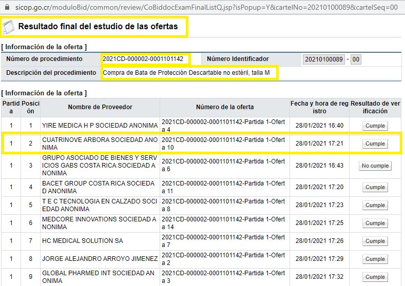 Entretanto, los resultados de la evaluación técnica aún está en proceso. Sin embargo, en los registros de la CCSS puede verificarse que Cuatrinove Arbora S. A. no dio muestras de las batas que deseaba vender.