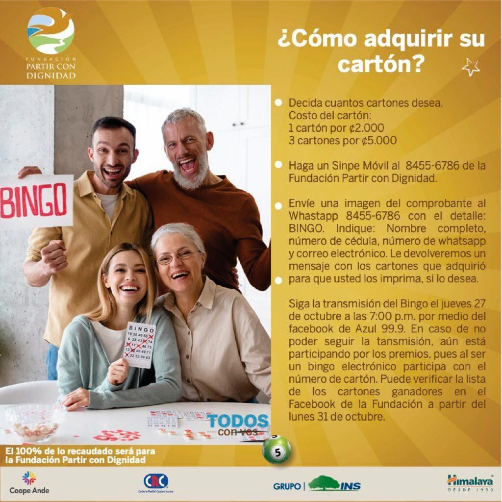 Usted puede colaborar con este trabajo en Cuidados Paliativos comprando un cartón por ¢2.000 o tres por ¢5.000 por medio del Sinpe 8455-6786. Una vez hecha la transferencia, debe enviar a ese mismo número sus datos: nombre, cédula, teléfono y un correo electrónico.
