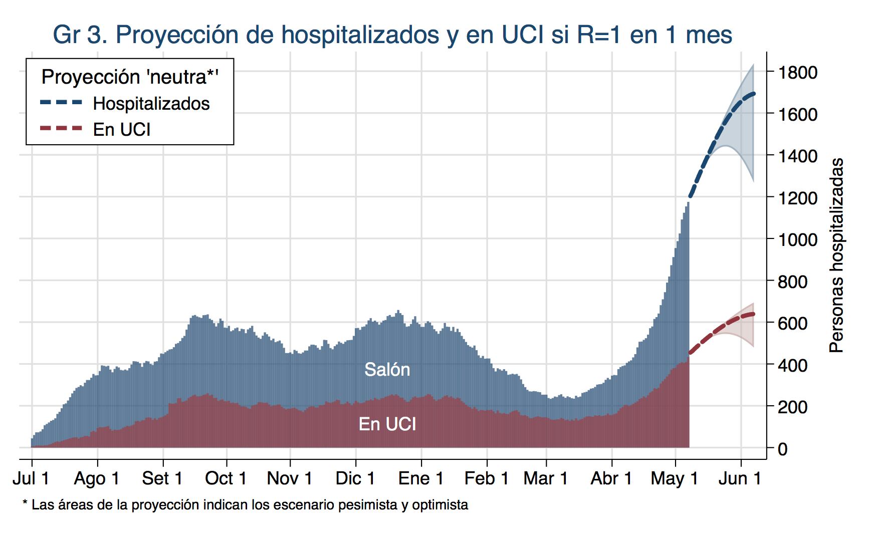 “Si dentro de un mes la tasa R recupera al umbral de R=1, la curva pandémica del país alcanzará un pico de cerca de 2.800 nuevos diagnósticos diarios en promedio, con 1.700 personas hospitalizadas, algo más de 600 de ellas requiriendo cuidados intensivos”, proyecta el demógrafo.