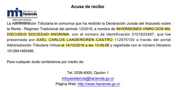 Según el Ministerio de Hacienda, el contador público Axel Landergren Castro presentó, en 2018 y 2019, las declaraciones juradas del impuesto sobre la renta de Inversiones Vinro 2016 S. A., sociedad anónima presidida por Vindas desde 2016 y dueña de un gimnasio en La Guácima, Alajuela.
