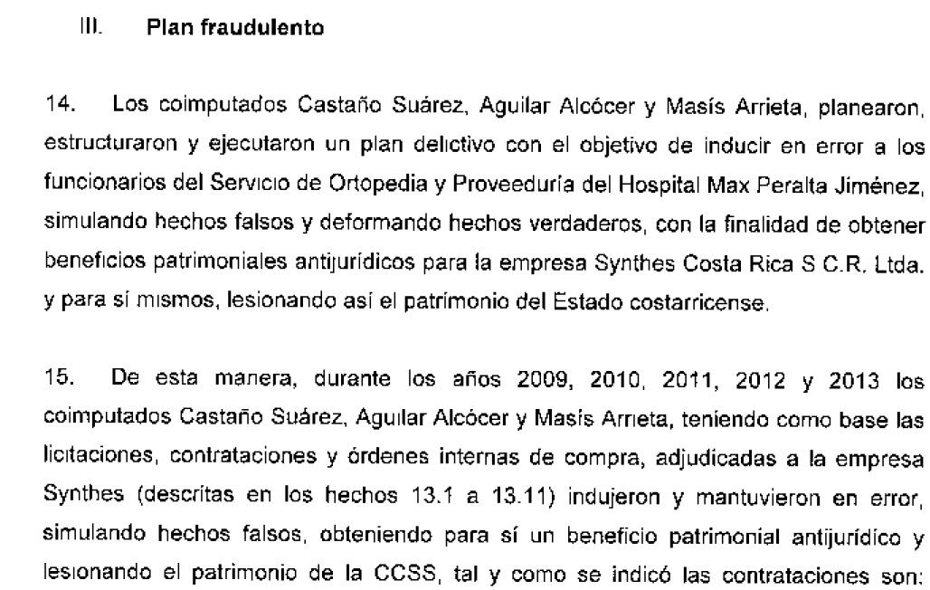 "Todos los justiciables actuaron con el dolo directo de defraudar el patrimonio de la Caja (…) siguiendo un plan previamente acordado en distribución de funciones se logró el objetivo perseguido de defraudar con el mayor número de facturas y en el menor tiempo posible”, sostiene la acusación, en la cual se aporta un total de 44 testigos entre peritos, especialistas, funcionarios de Synthes y de la CCSS y pacientes.
