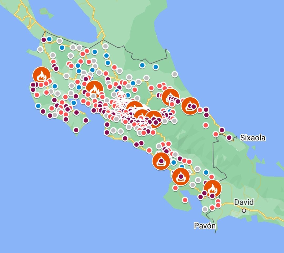 Por ejemplo, al dar clic sobre el distrito Bolsón de Santa Cruz de Guanacaste, con una población de 2.113 habitantes, el Riesgo Q20 es de 18%, la incidencia relativa es de 0,3; el promedio de casos semanales es de 3 y los casos esperados son 11.