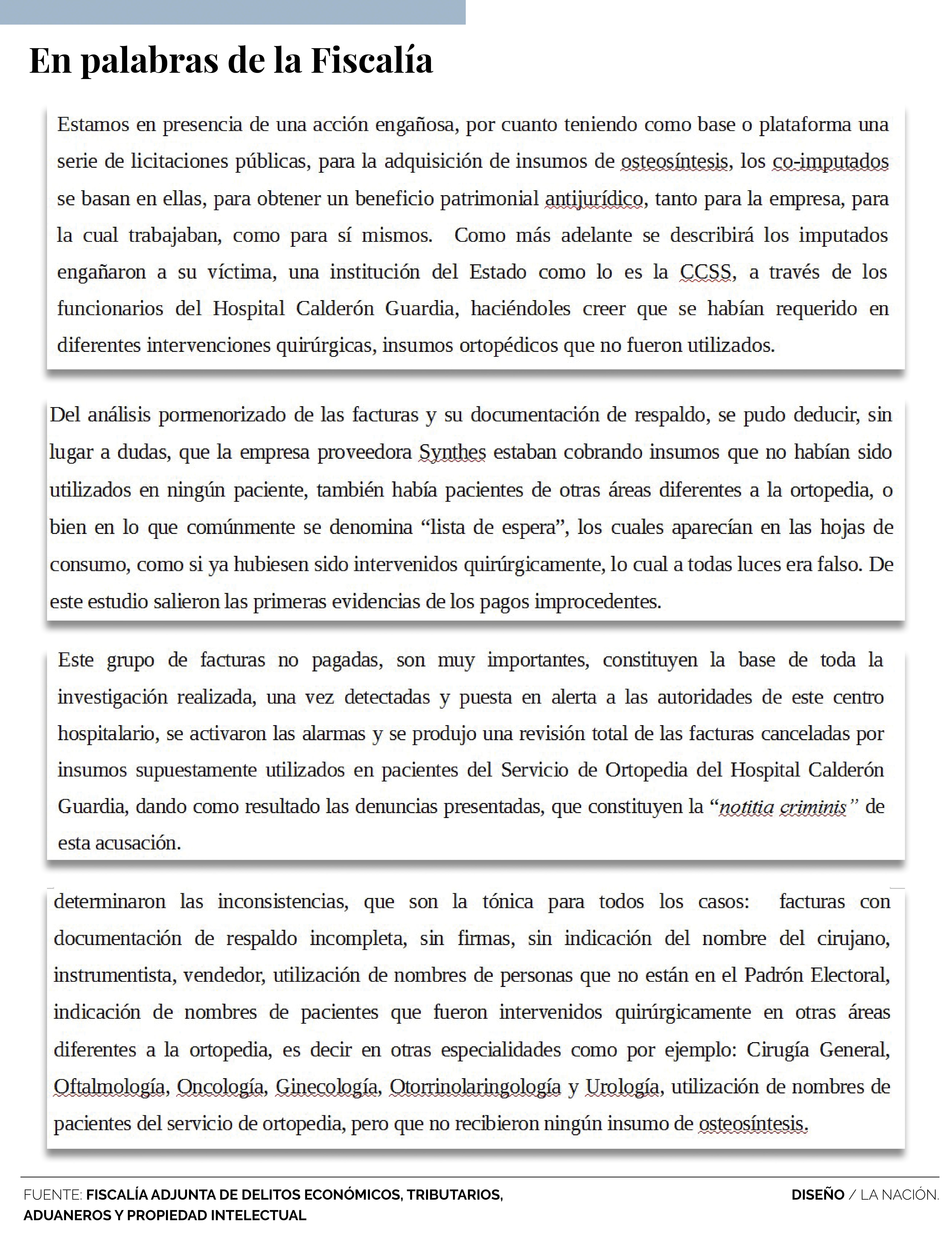 ”(...) planearon, estructuraron y ejecutaron un plan delictivo con el objetivo de inducir en error a los funcionarios del Servicio de Ortopedia y Proveeduría del Hospital Calderón Guardia, simulando hechos falsos y deformando hechos verdaderos, con la finalidad de obtener beneficios patrimoniales antijurídicos para la empresa Synthes Costa Rica S.C.R. Ltda. y para sí mismos, lesionando así el patrimonio del Estado costarricense y Caja Costarricense de Seguro Social", menciona la acusación.