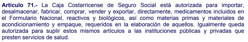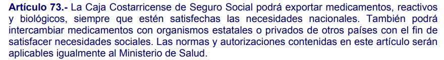 "El artículo 71 de la Ley Constitutiva de la Caja establece que la institución podrá vender a las entidades del sector salud, públicas y privadas, nacionales o extranjeras, y a personas particulares, aquellos medicamentos que no estén disponibles en el mercado farmacéutico nacional para cubrir la necesidad de tratamiento prescrito por un médico, siempre y cuando no se vean afectadas las existencias para el consumo regular de la institución", explicó Chaves.