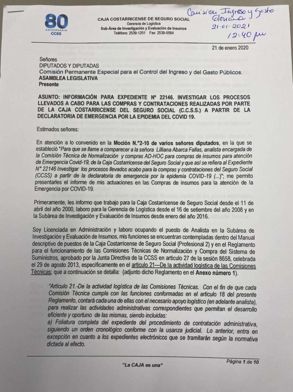 Se trata de Lilliana Abarca Fallas, analista de la Comisión Técnica Ad-Hoc, quien compareció este jueves 21 de enero ante ese foro legislativo como parte de la investigación por presuntas irregularidades en la compra de equipo de protección médica por parte de la Caja Costarricense de Seguro Social (CCSS), durante la pandemia.