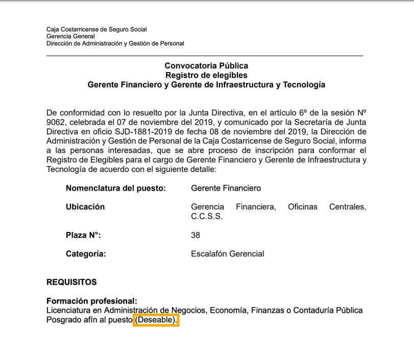 “En el caso del segundo registro de elegibles del gerente Financiero, todo el cartel es idéntico al del primer registro de marzo de 2018, excepto que se modifica el requisito académico y, el posgrado que era obligatorio se establece como ‘deseable’.