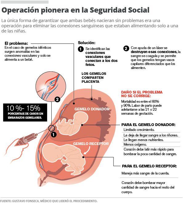 “El tratamiento consiste en ocluir esas conexiones a nivel de la placenta, visualizándolas directamente a través de una cámara y a un láser especial debidamente calibrado. Se queman, por decirlo así, esas uniones vasculares. Esto se hace porque una vez que se detecta esta dificultad, usualmente el problema continúa, y más bien se complican más los bebés y puede fallecer uno o ambos dentro de la pancita”, dijo el especialista, quien también realizó el procedimiento quirúrgico.
