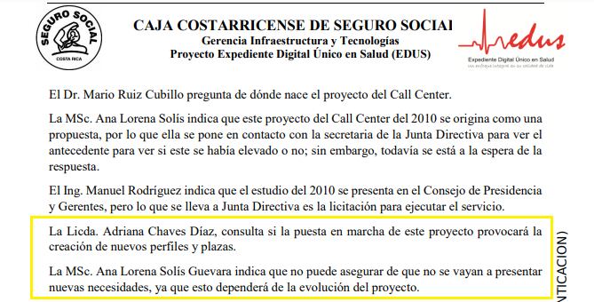 En la sesión del 18 de noviembre de 2020, Adriana Chaves Díaz, asesora de Macaya, preguntó si “la puesta en marcha de este proyecto provocará la creación de nuevos perfiles y plazas”.