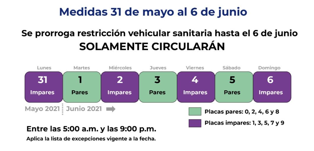 De esta forma, a partir del lunes, continuará la circulación de la mitad de los vehículos y se empezará por las placas impares, en horario de 5 a. m. a 9 p. m.