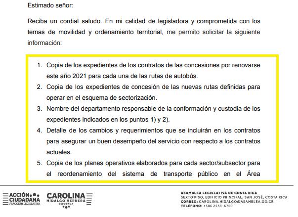 El 6 de abril del presente año, Carolina Hidalgo, diputada del Partido Acción Ciudadana (PAC) envió un oficio al ministro de Obras Públicas y Transportes, Rodolfo Méndez Mata, en el que pidió información detallada sobre el proceso de renovación de concesiones de autobús.
