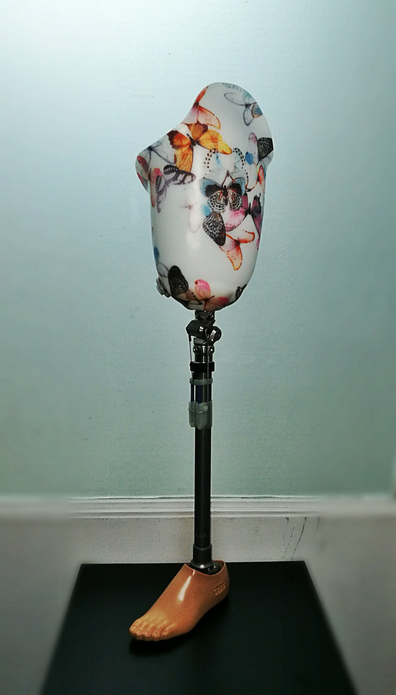 Esa manga se confeccionó de un plástico o polímero especial. La paciente escogió un diseño de mariposas quizá porque, al igual que ellas, la prótesis representó un cambio sustancial en su vida y le dio libertad para continuar.