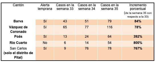 El mayor aumento se da en Río Cuarto, uno de los últimos cantones del país en reportar enfermos. Este pasó de tener 6 casos a 78 dos semanas después.