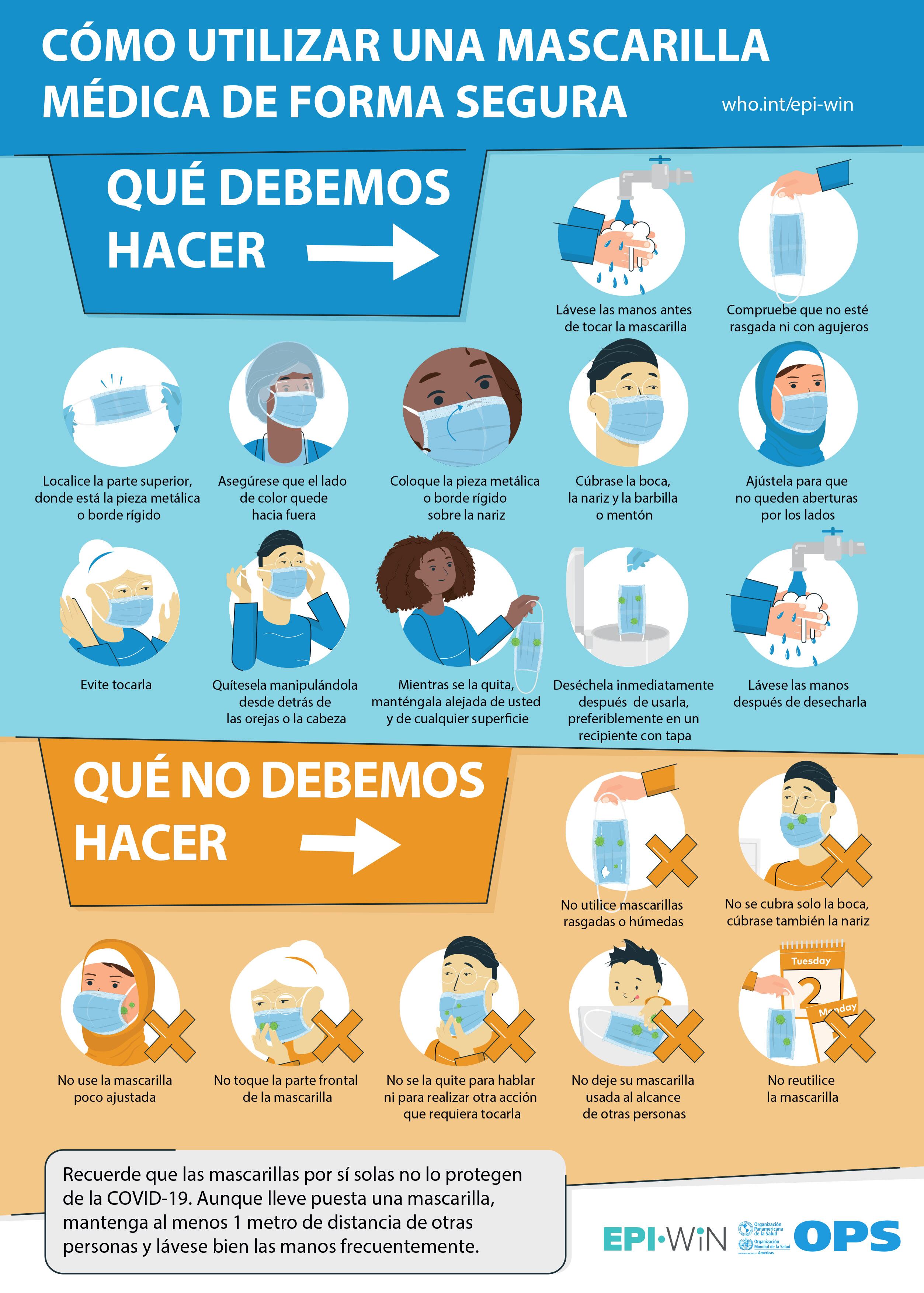 “La gente se puede contaminar si utiliza las manos sucias para ajustarse la mascarilla o para quitársela y ponérsela varias veces; las mascarillas pueden crear una sensación falsa de seguridad, lo que hace que las personas se olviden de medidas como lavarse las manos o mantener el distanciamiento físico. Las mascarillas por sí solas no los van a proteger de covid-19, las mascarillas no sustituyen el distanciamiento físico, el lavarse las manos u otras medidas de salud pública".