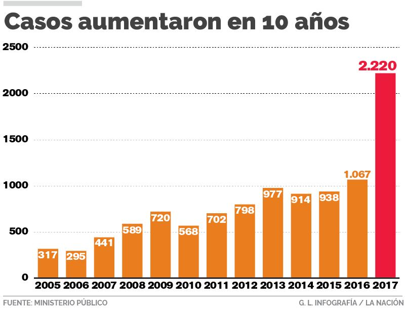 Esa cifra representa el doble de las causas tramitadas en el 2016 y es también un 400% mayor a lo que se registraba hace 10 años, cuando se atendieron 441 denuncias por este delito.