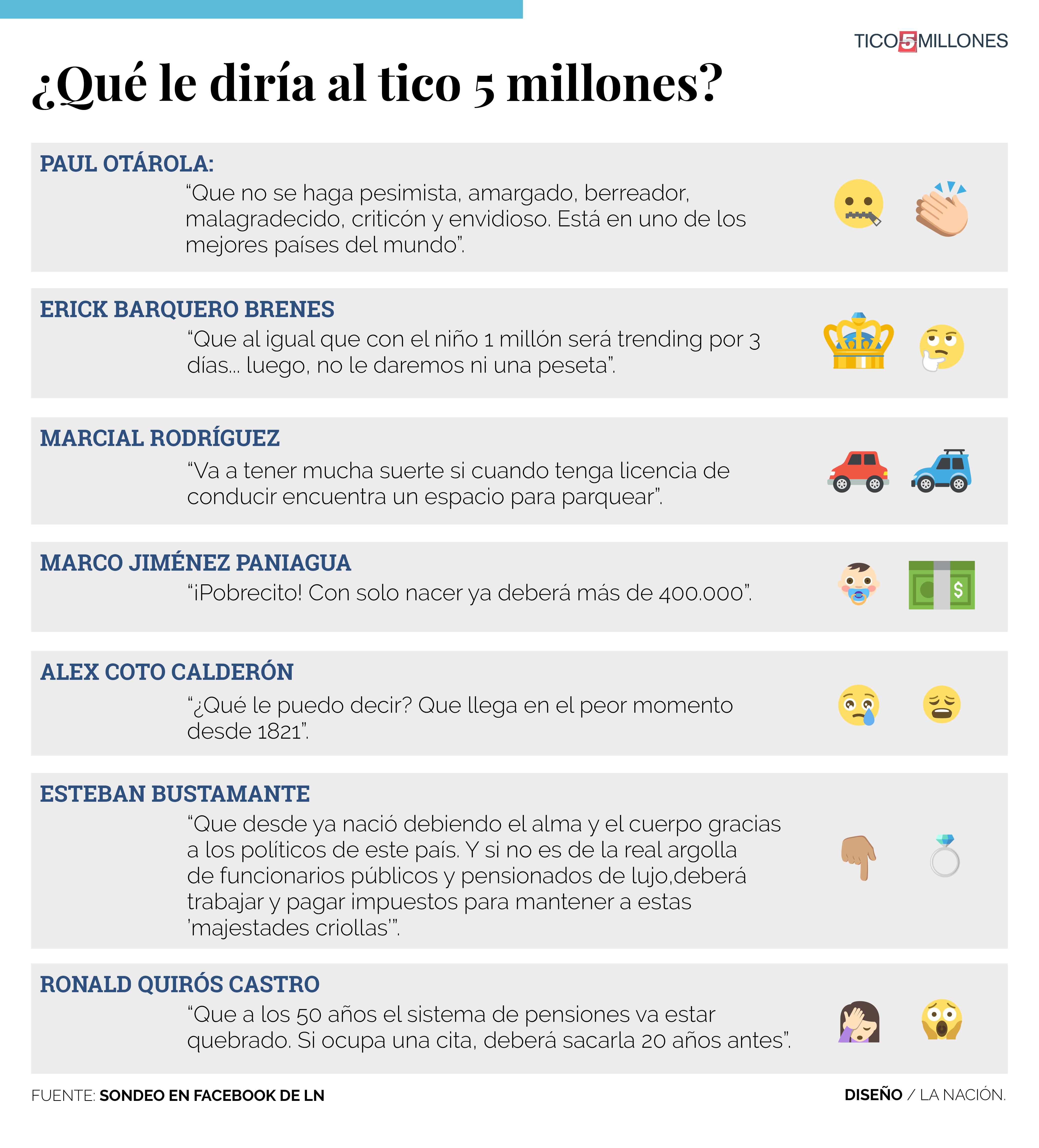 El pesimismo y la desesperanza que describe el médico quedaron patentes en varios de los mensajes escritos por lectores de este diario en Facebook, cuando se les preguntó qué le dirían al tico 5 millones.