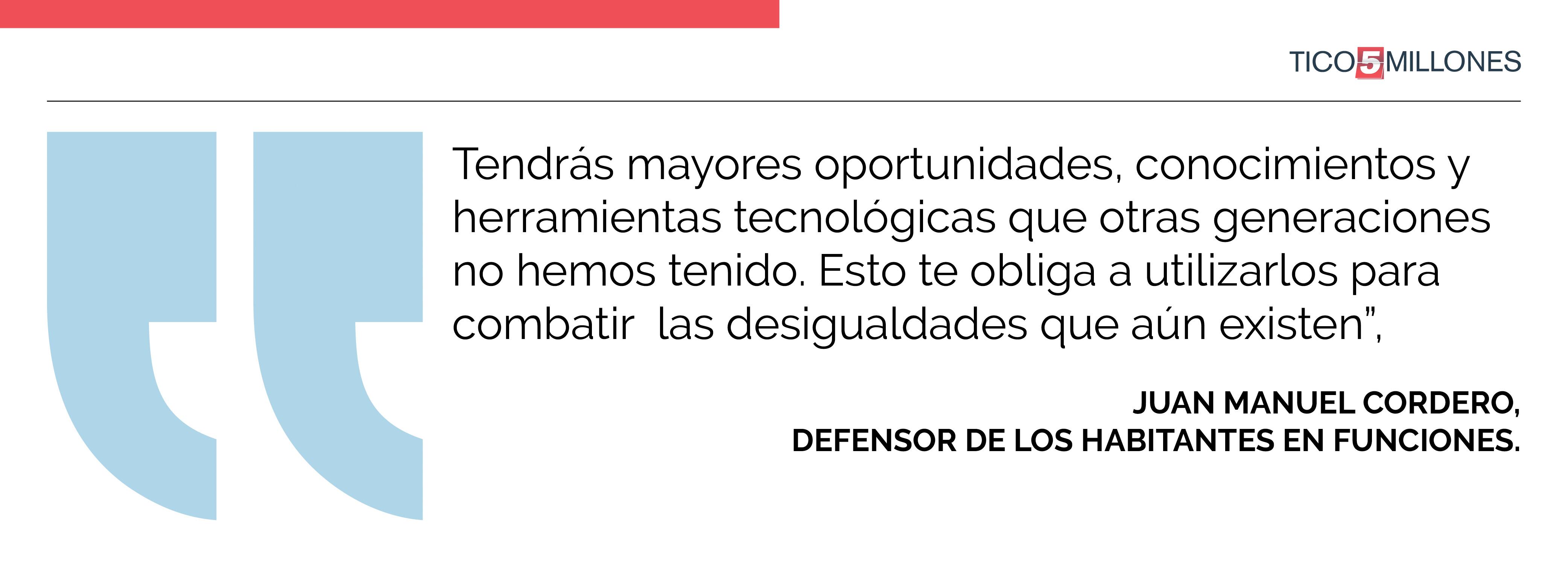 “La principal oportunidad es que será un partícipe en la construcción de la sociedad de la segunda mitad del siglo XXI, que esperemos sea una sociedad innovadora, más democrática, participativa y más equitativa. Sobre sus hombros, en una generación relativamente pequeña, va a tener que cargar con una población envejecida. Pensemos que alrededor del año 2040 un 25% de la gente tendrá más de 60 años”, advierte el director del programa Estado de la Nación, Jorge Vargas Cullel.