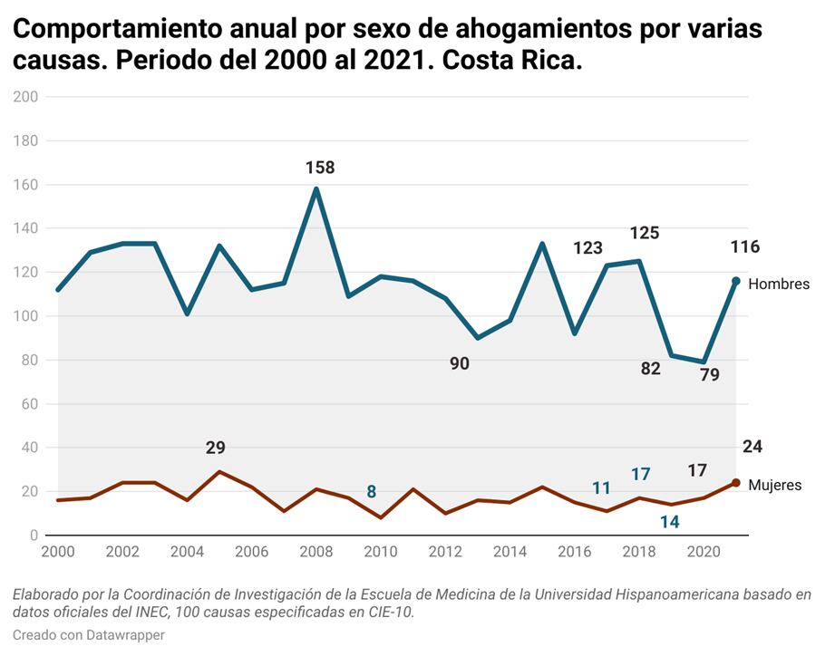 Entre los años 2000 y 2021, murieron ahogadas en Costa Rica 2.899 personas. Los decesos ocurrieron en sitios como bañeras, piscinas, en el mar, ríos o pozas, revela un informe de la Coordinación de Investigación de la Escuela de Medicina de la Universidad Hispanoamericana, centrado en esta causa de mortalidad.