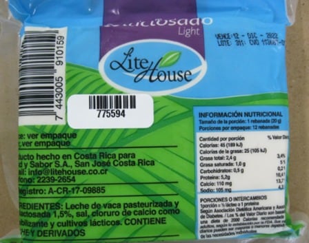 - Lote: 311 del queso tipo Turrialba deslactosado light, marca LITE HOUSE, registro sanitario A-CR-17-09885.