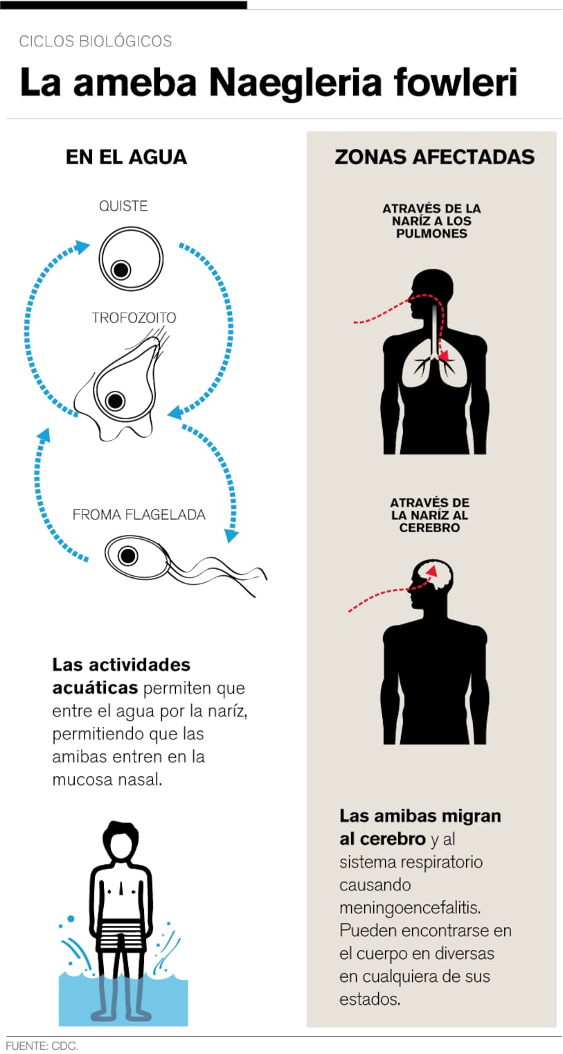 Según el Centro para el Control y Prevención de las Enfermedades (CDC) de Estados Unidos, la ameba causa infección cuando entra por la nariz y sube al cerebro, donde destruye el tejido.