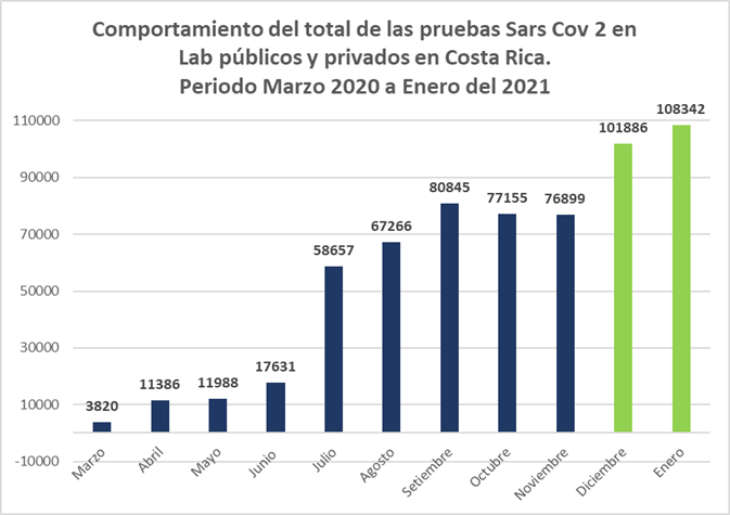 “En el mes de diciembre del 2021, el país por fin llegó a las 100.000 pruebas PCR y antígenos incluyendo las muestras de laboratorios públicos y privados. Luego, en enero experimentó un crecimiento de un 6% con respecto al mes anterior”, añade.