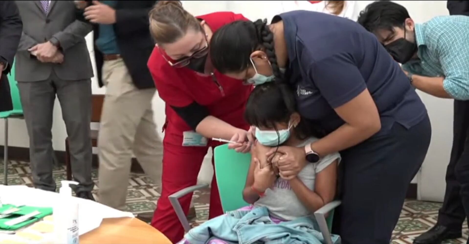 Génesis Molina Amador, una turrialbeña 11 de años, fue la primera niña costarricense en recibir la vacuna contra la covid-19. Ella forma parte de un grupo de pacientes ambulatorios del Hospital Nacional de Niños (HNN) que, por sus factores de riesgo, tienen mayor riesgo de complicarse en caso de infectarse. Todos los menores vacunados este lunes fueron acompañados por uno de sus padres durante el proceso.