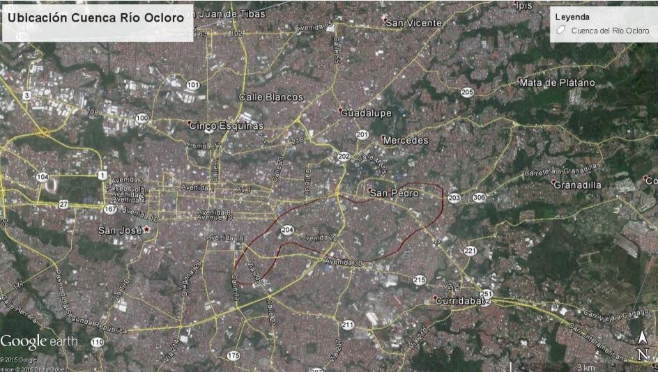 El Río Ocloro recorre los distritos josefinos de Catedral y Zapote, San Pedro de Montes de Oca, Granadilla y el distrito central de Curridabat.