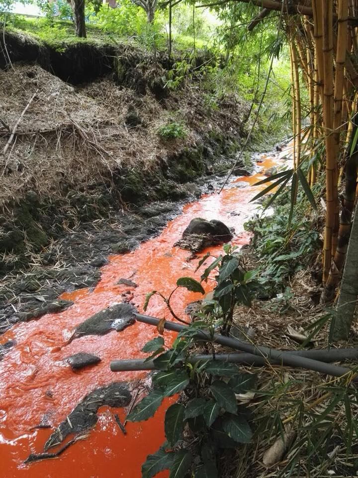 Vecinos de Montes de Oca y Curridabat denunciaron dos casos de contaminación del río Ocloro en la última semana. Hace cinco días el río se tornó color rosado y este miércoles tomó un fuerte tono rojizo.