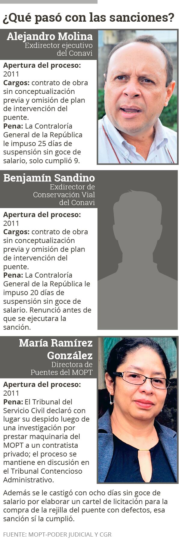 La CGR dejó en firme, en febrero de 2016, una sanción de 25 días de suspensión sin goce de salario al ingeniero Alejandro Molina, exdirector ejecutivo del Consejo Nacional de Vialidad (Conavi) y de 20 días de suspensión sin goce de salario al también ingeniero Benjamín Sandino, exdirector de Conservación Vial del Conavi.